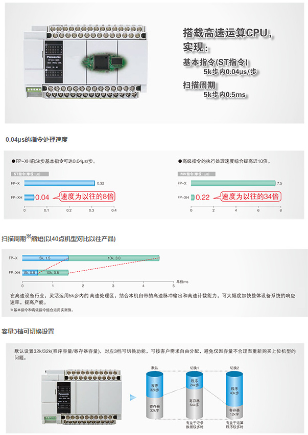 · 程序容量4檔可調(diào):64k/40k/32k/24k 步,數(shù)據(jù)容量對應(yīng)變化:12k/24k/32k/64k字